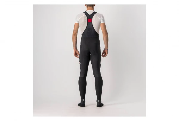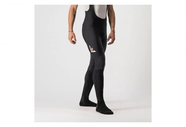 Pour le bas de la jambe juste en dessous du genou, Castelli passe à son tissu extensible en molleton Nano Flex qui est à la fois chaud et hautement hydrofuge pour une protection contre les projections provenant des routes mouillées. Il est également très extensible et Castelli laisse un bord brut pour pouvoir construire les chevilles sans fermetures éclair tout en veillant à ce que le collant reste facile à mettre et à enlever. Le coussin de siège Kiss Air2 et les bavettes en maille gardent vos fesses et le haut du corps heureux, tandis que les grands détails réfléchissants vous permettent de rester visible.